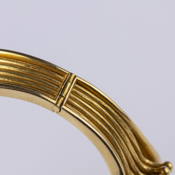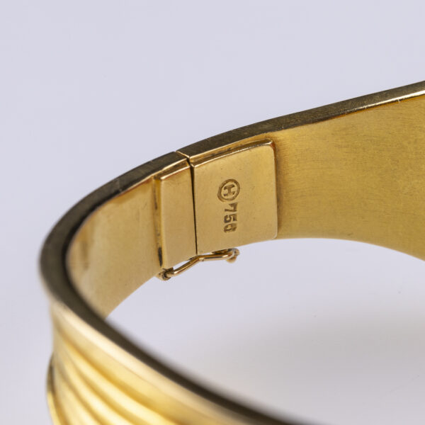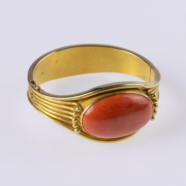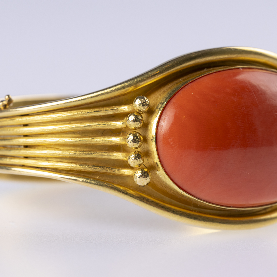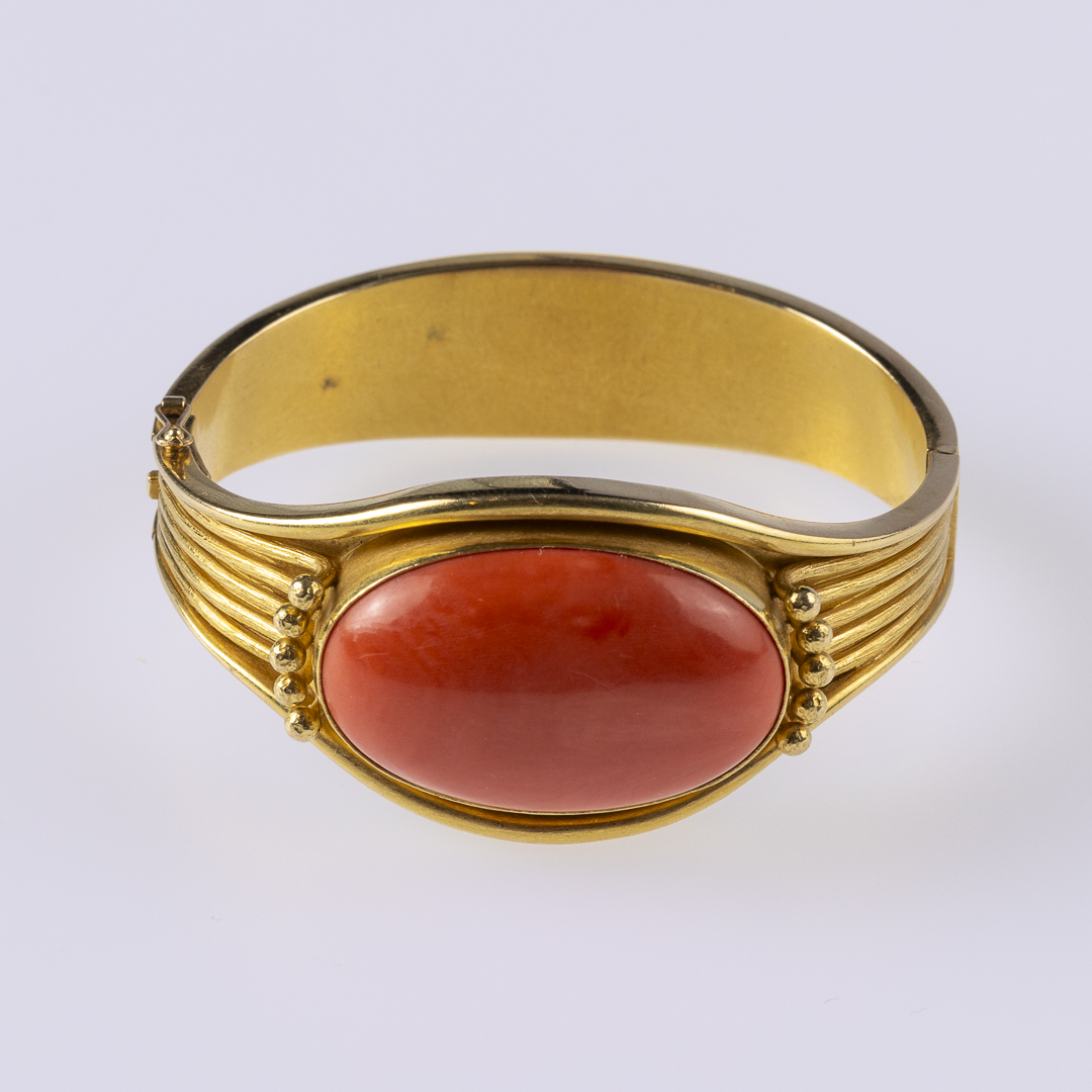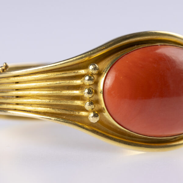 Armreif, Koralle, G750 ca. 79,7 g. Grosse Koralle ca. 3,5 x 2,5 cm, Innenmaß: ca. 5,7 x 5,0 cm. – Handarbeit