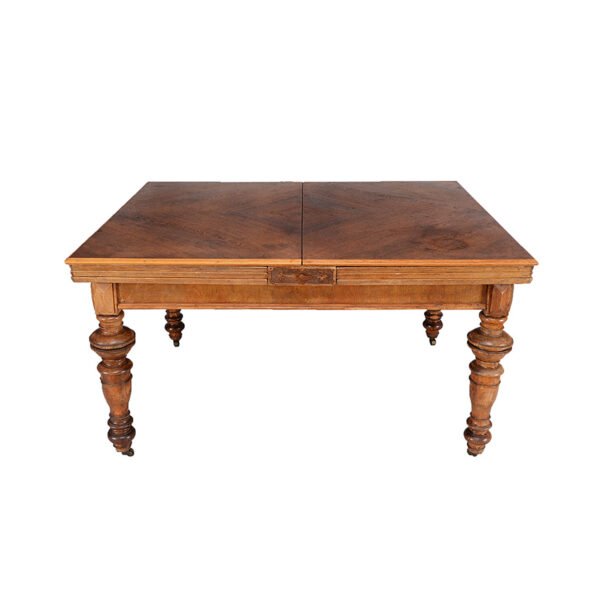 Richard Saalfelds Patent Automaten-Tisch. Kulissentisch, auf über 5 Meter ausziehbar, ausklappbare Beine, erweiterbar ohne Zusatzplatten – alles integriert. Das Möbel ohne Einlegeplatten von einer Person zu handhaben. Maße ca. 140 x 110 x 75 cm.